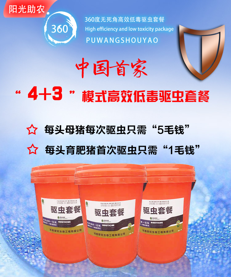 控制豬場盜竊病的有效法寶,陽光助農(nóng)驅(qū)蟲套餐!4+3驅(qū)蟲新模式,高效、安全、廣譜,任何階段的母豬都可添加,母豬群一年驅(qū)4次,3個月用一次,商品豬一生驅(qū)蟲三次,分別為60天,90天,120天,每次驅(qū)蟲用7至10天!