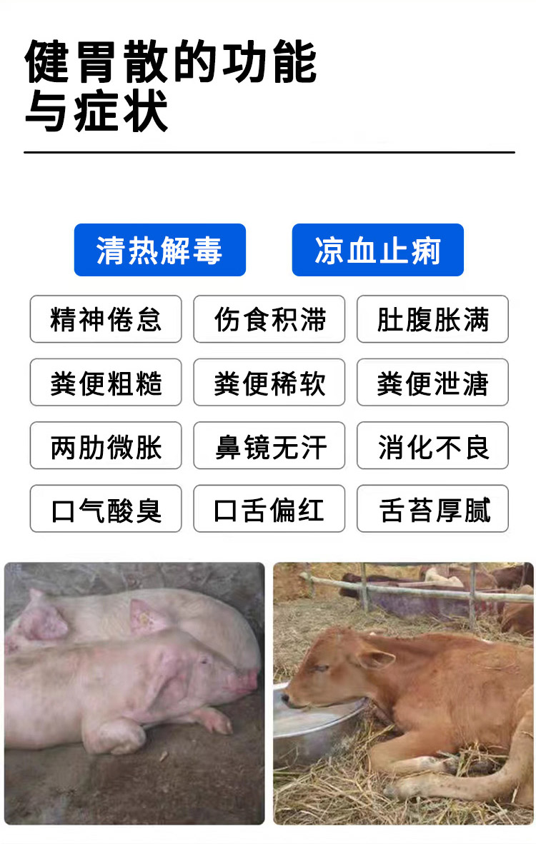 【主治】傷食積滯,消化不良。癥見精神倦怠,水草減少或廢絕,肚腹脹滿,糞便粗糙或稀軟,完谷不化,口氣酸臭,口色偏紅,舌苔厚膩,脈象洪大有力。牛反芻停止,兩肋微脹,嚴重時鼻鏡無汗,大便瀉溏、惡臭。