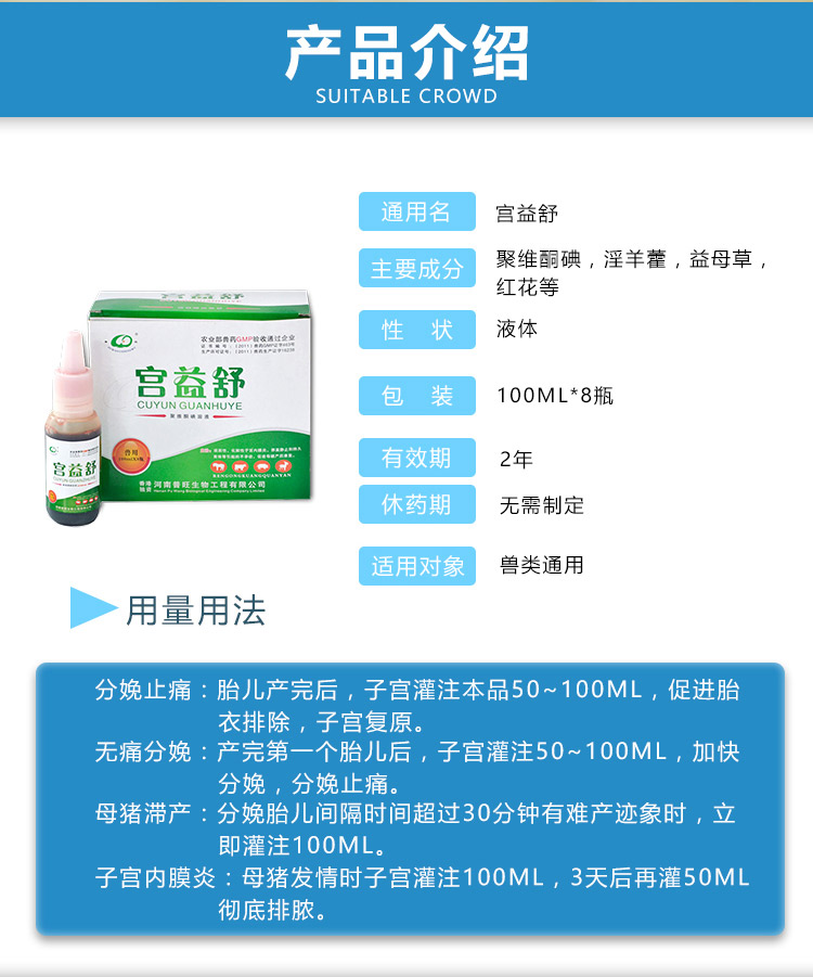 【用法用量】分娩止痛:胎兒產(chǎn)完后,子宮灌注本品50-100ml,促進(jìn)胎衣排出、子宮復(fù)原。