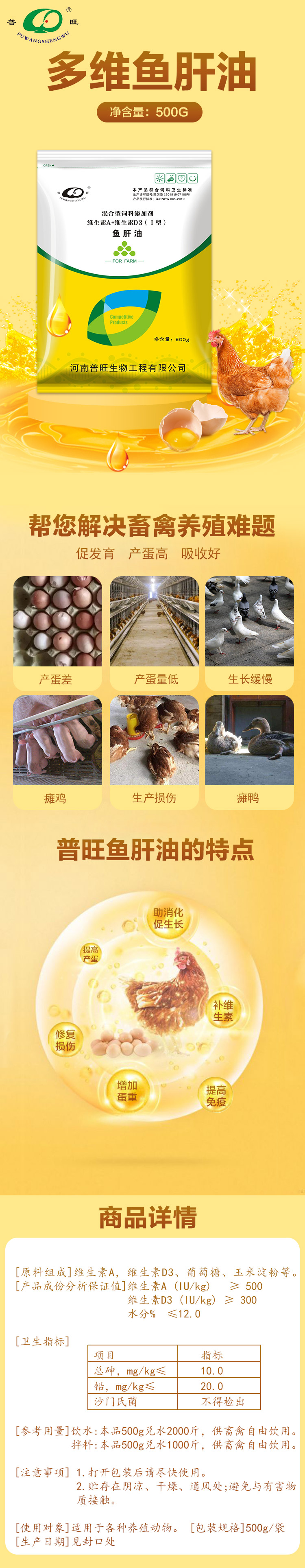 產品簡介:普旺多維魚肝油混合型飼料添加劑 促發育產蛋高吸收好補充維生素 提高免疫力,助你解決養殖難題。