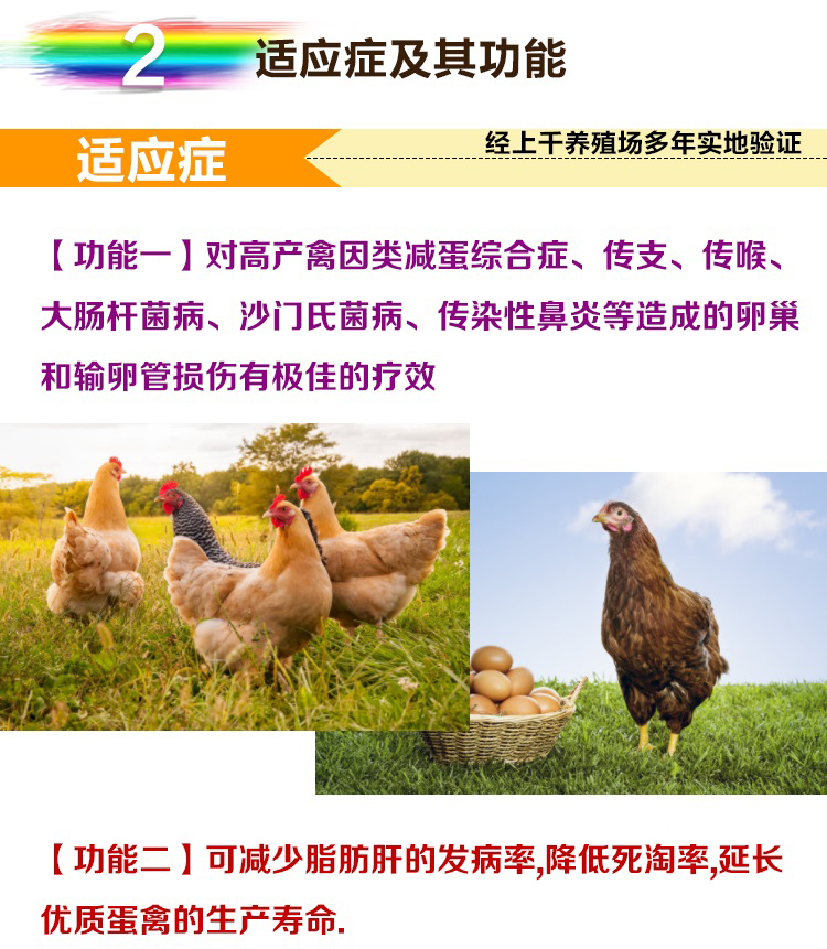1. 延長雞產(chǎn)蛋高峰 2.增加產(chǎn)蛋率蛋重 3.防治雞輸卵管炎 4.促進(jìn)雞卵泡發(fā)育 5.防治產(chǎn)蛋疲勞癥