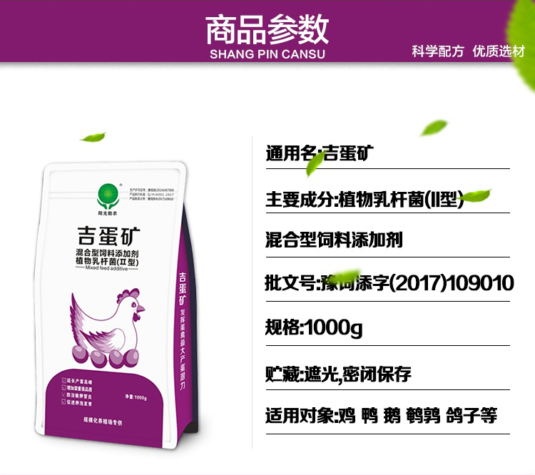 本品提高輸卵管腺體功能,強(qiáng)化分泌蛋清,促進(jìn)鈣質(zhì)和色素的沉著,使蛋殼質(zhì)地強(qiáng)韌、光滑、亮澤,使用吉蛋礦7-10天,蛋殼質(zhì)地變密變厚,破損率整體減少80%以上,手感圓潤,顏色自然。