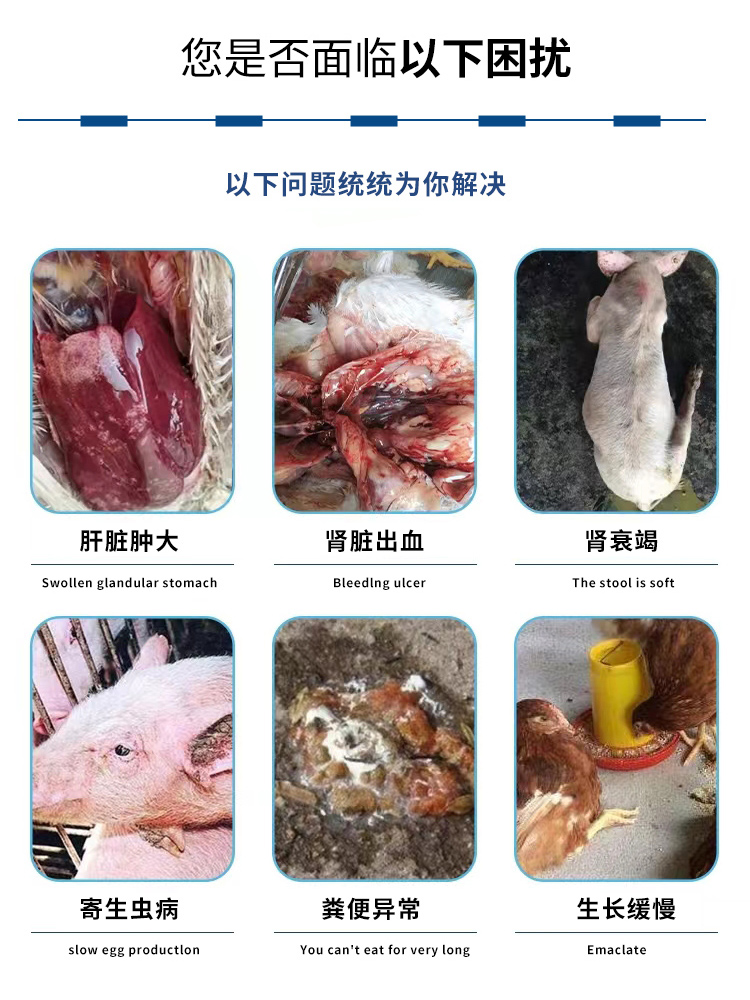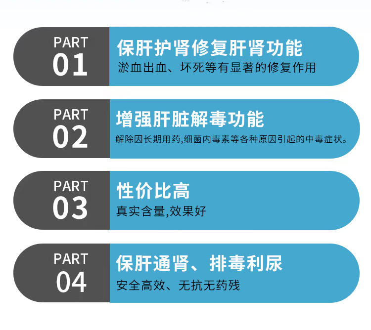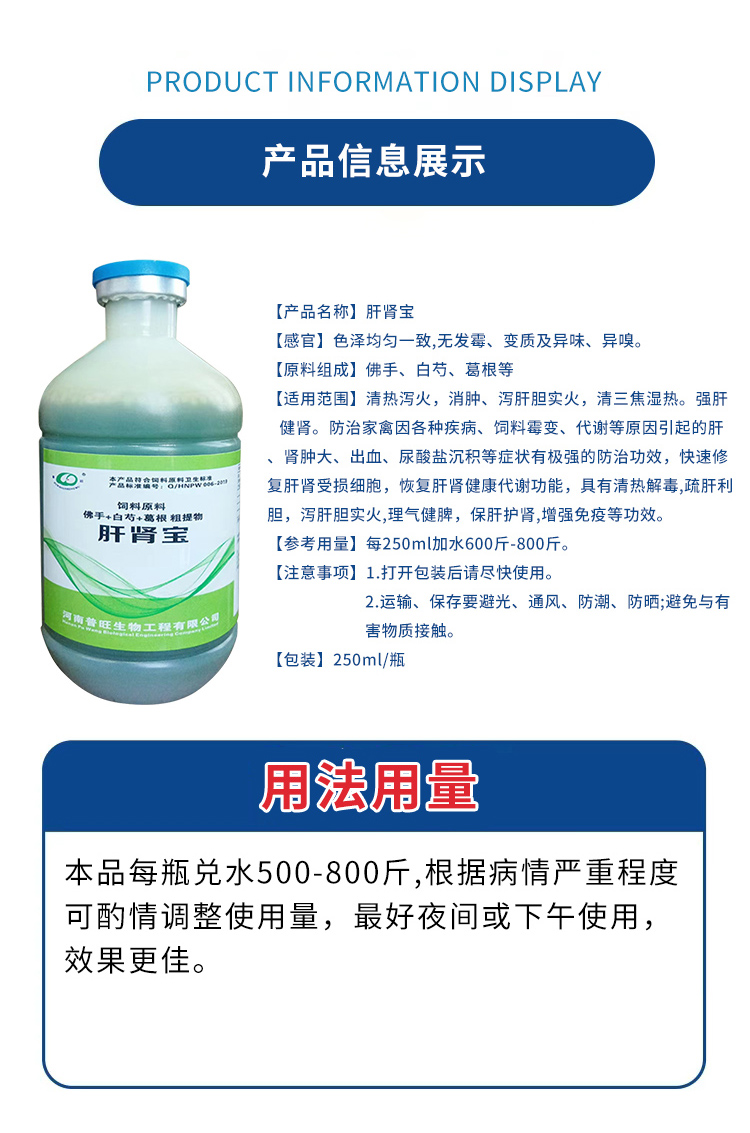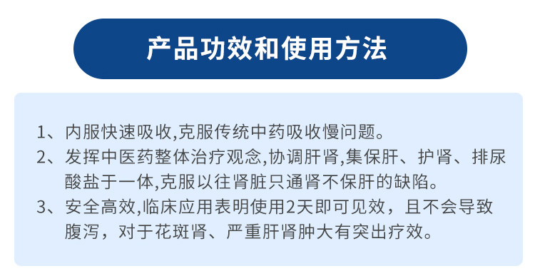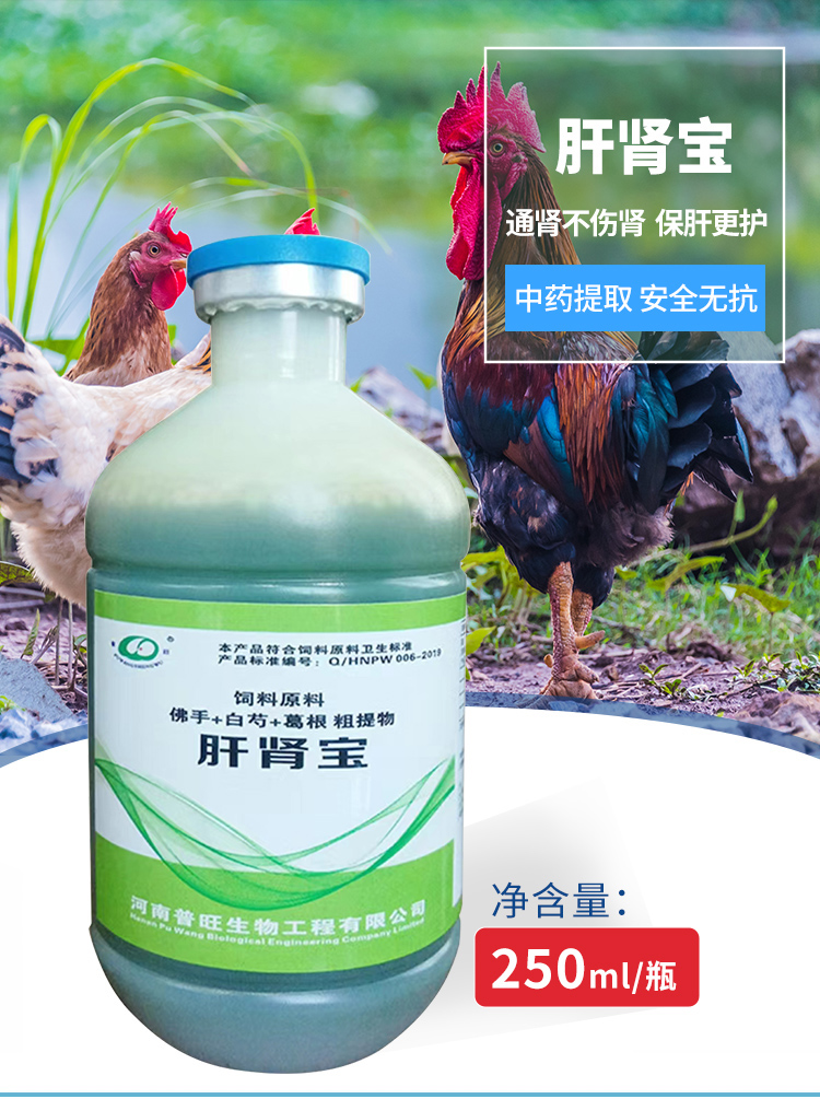 防治家禽因各種疾病、飼料霉變、代謝等原因引起的肝、腎腫大、出血、尿酸鹽沉積等癥狀有很強(qiáng)的防治功效,快速修復(fù)肝腎受損細(xì)胞,恢復(fù)肝腎健康代謝功能,具有清熱解毒,疏肝利膽,瀉肝膽實(shí)火,理氣健脾,保肝護(hù)腎,增強(qiáng)免疫等功效。