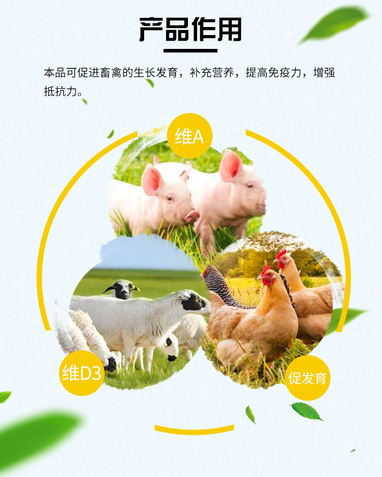 【功能與特點(diǎn)】本品能促進(jìn)畜禽生長(zhǎng)發(fā)育,補(bǔ)充基礎(chǔ)飼料中維生素的不足,提高動(dòng)物的抗應(yīng)激能力,改善繁殖功能,提高家禽成活率、產(chǎn)蛋率、孵化率、育成率、防止下軟蛋、蛋形變小和產(chǎn)蛋率降低等癥。對(duì)因缺乏維生素ADE引起的發(fā)育不艮,生長(zhǎng)緩慢,有利于快速恢復(fù)。